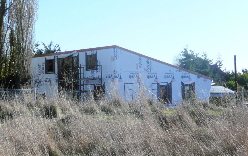 The "shiny penny" metal roof and cranberry red windows will soon be matched up with zincalume corrugated metal siding for an industrial look. We like our architects addition of the angled "wings" in front to meet the shed roof! Not just another rectangular box!